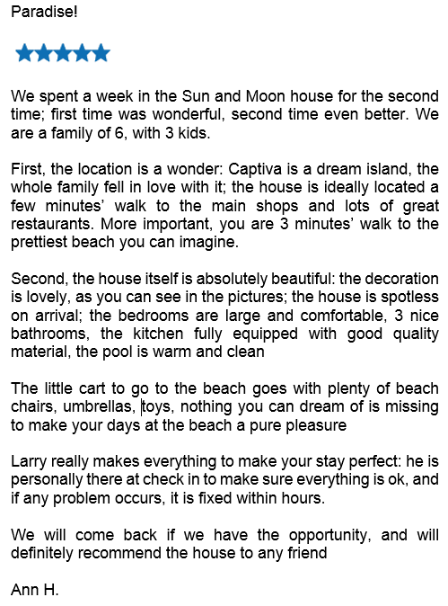 This home is not managed by a management company, but by us, the owners. We personally supervise and assist our cleaning staff each Saturday. As the last to walk out the door prior to your arrival, we can assure you the Sun & Moon is one of the most immaculate and best prepared homes on Captiva, both inside and outside.