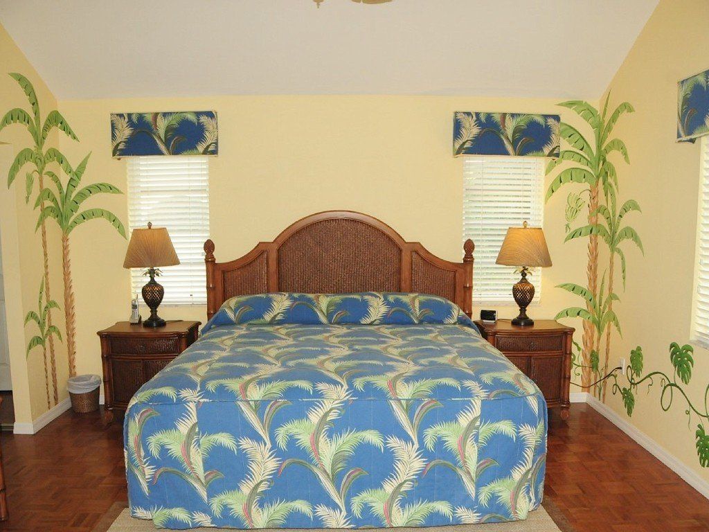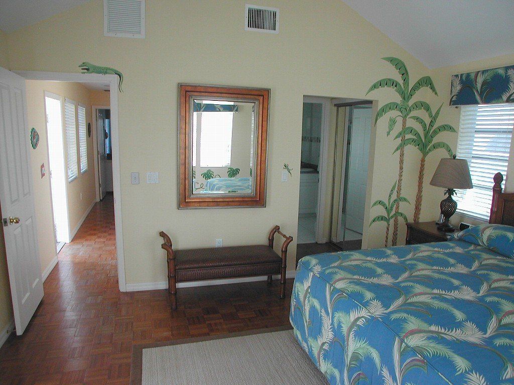 The master bedroom on the second floor has a king-size bed, its own full bath, and 32" HDTV. The "sun & moon" deck is accessible from this room as well as the hallway.