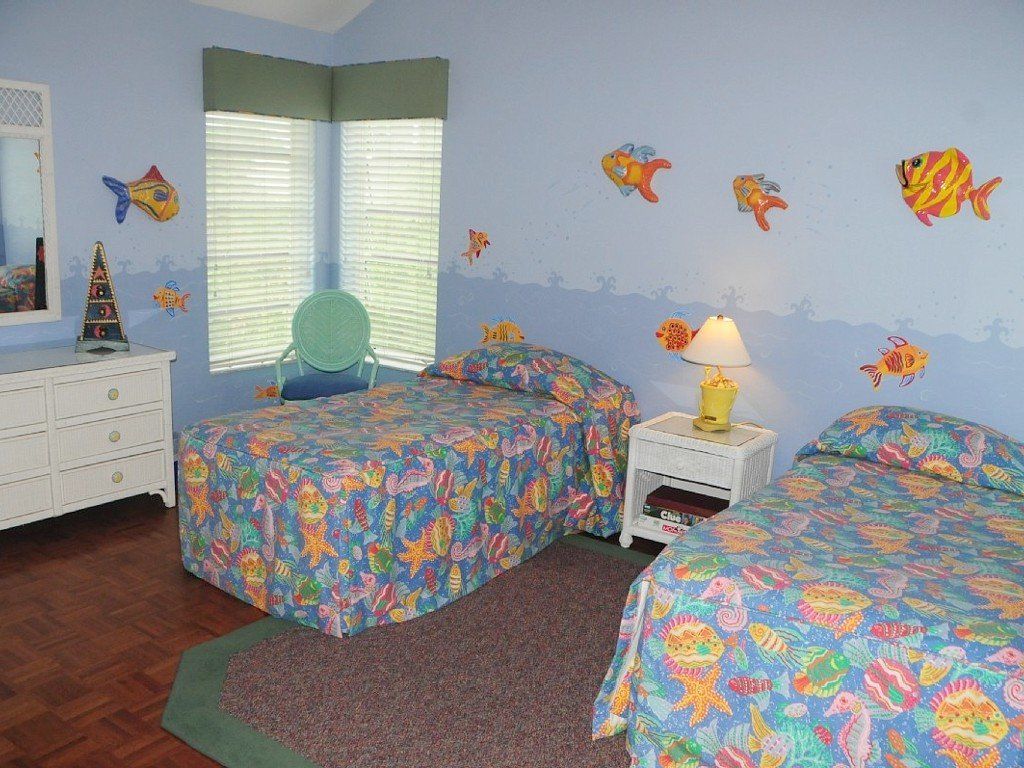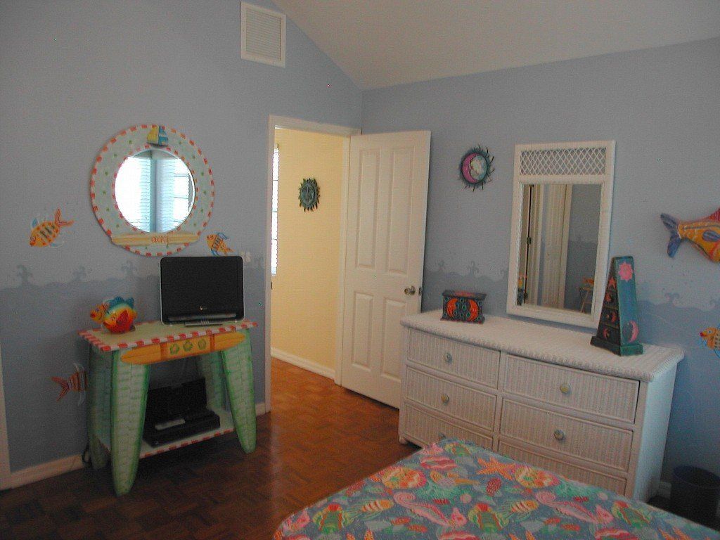The second floor guest bedroom has two twin beds, HDTV/DVD, Receiver and CD player, and its own bath in the room. Children love this spacious and well decorated room, and the twin beds can be placed together (with advance notice) and made up as a King size bed for a couple.